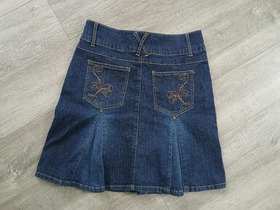 Джинсовая юбка синего цвета из качественного денима. Размер 42 (S), но лучше ориентироваться на замеры. Длина изделия — 46 см, полуобхват бедер — 44 см. Юбка украшена вышивкой на заднем кармане. Подходит для создания повседневного образа.