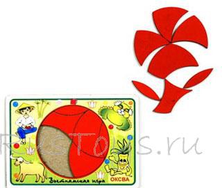 Круг, разрезан на части таким образом, что элементы, его составляющие, имеют округлые контуры. Это позволяет конструировать из них большое количество силуэтов различных птиц, животных, цветов.