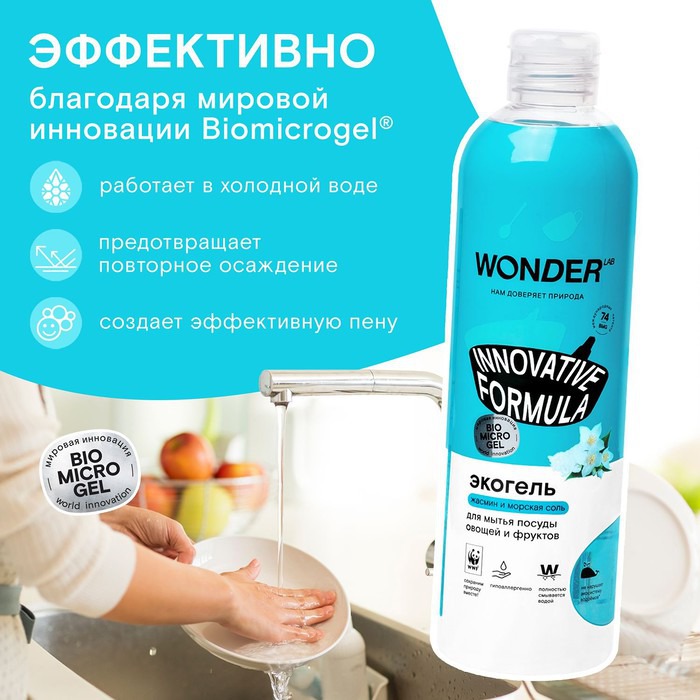 Инновационная формула эко средства не нарушает экосистему водоемов, так как не содержит агрессивных компонентов. Мы любим природу и заботимся об окружающей среде. WonderLab не поддерживает тестирование на животных, а уникальная формула BIOMICROGEL разлагается в природе на 98% за 1 день.